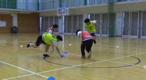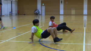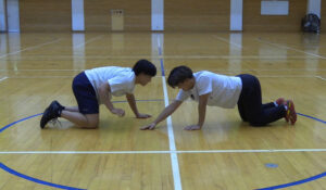 あおむけの状態でクモのように歩いてリレーをします。お尻をつかないように気を付けて。
