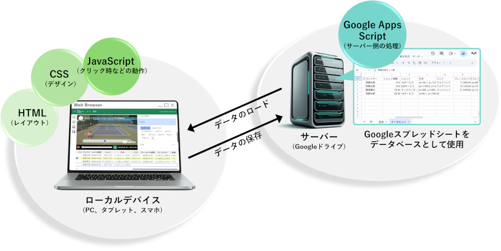 ローカルデバイス(ブラウザ)の設計はHTML、CSS、JavaScriptを使用し、サーバー側ではGoogle Apps Scriptを使う。Googleスプレッドシートをデータベースとして使用できる点は個人開発のコスト面では大きなメリット。