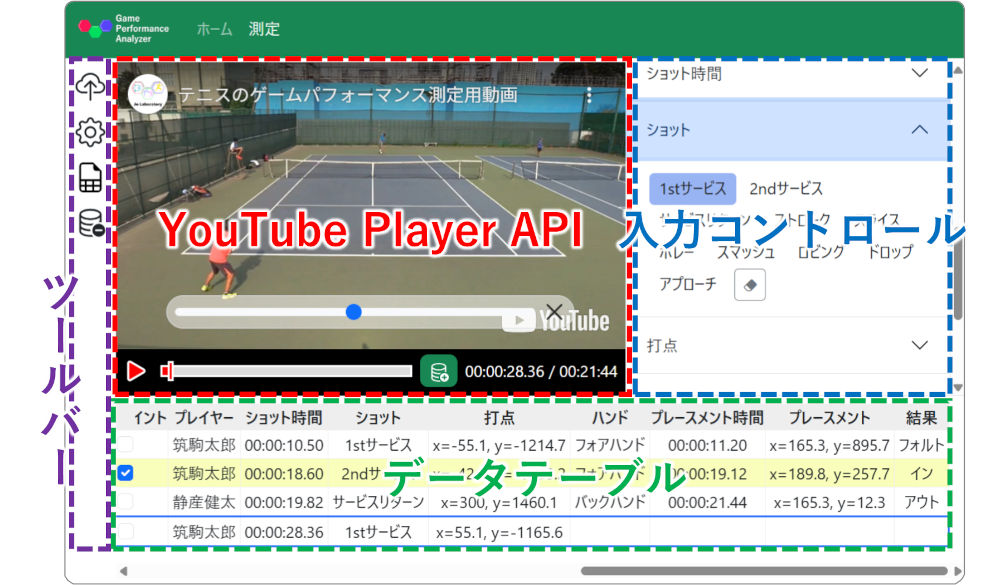 YouTubeの動画って、よく一般サイトに埋め込まれていますよね。その埋め込み型のYouTubeを、JavaScriptで自由に再生・停止・コマ送りをしたり、再生位置(動画上の時間)を取得したりすることができるのが、YouTube Player APIです。これを使えば、自分のWebアプリにYouTubeプレイヤーを埋め込んで、JavaScriptで自由に制御できますし、動画を保存するサーバーを用意する必要がなくなるので、スポーツデータの測定アプリにはぴったりなのです。