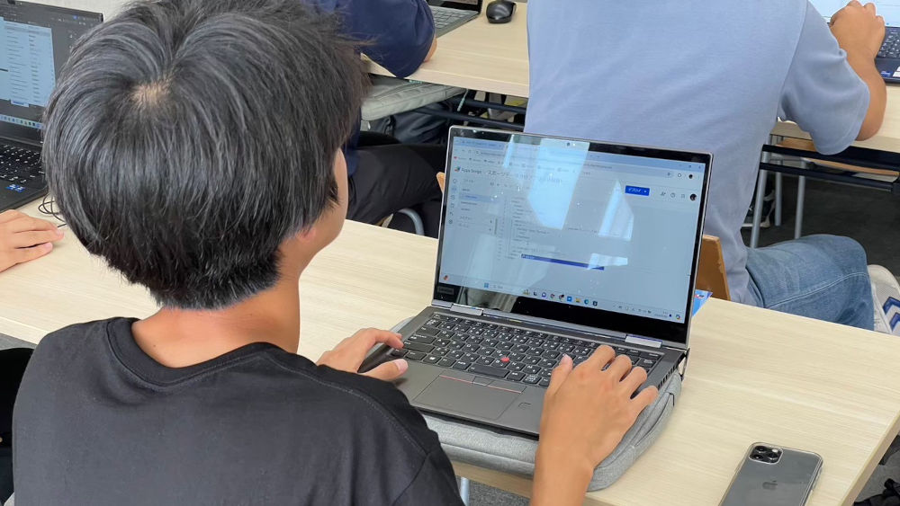 とはいっても初心者の高校生ですから、ゼロから自分ですらすらと書けるはずがありません。そのため、実際はこちらで用意したコードを写しながら、「これはこのボタンで」とか「ここを押すとこのコードが実行されて」というように、仕組みをイメージしながら作ってもらいました。
