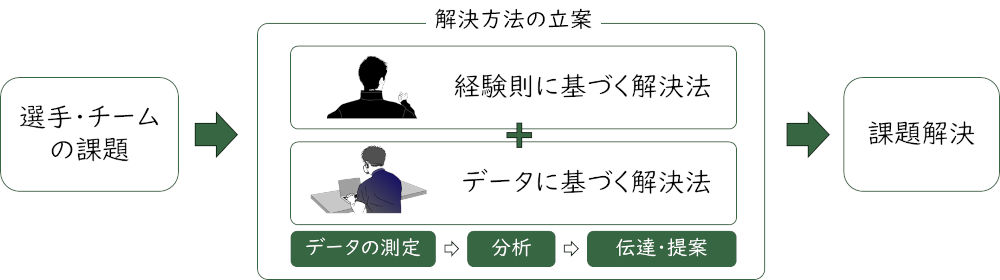 スポーツアナリティクスとは、試合中やトレーニング中のデータを測定し、分析、要約を行って、選手やコーチを情報面でサポートすることです。どんな選手・チームであっても、目標達成に向けた課題を抱えているはずであり、それを解決するために、従来の経験則に加えて、データの測定・分析に基づいた解決法を提案することが求められているのです。
